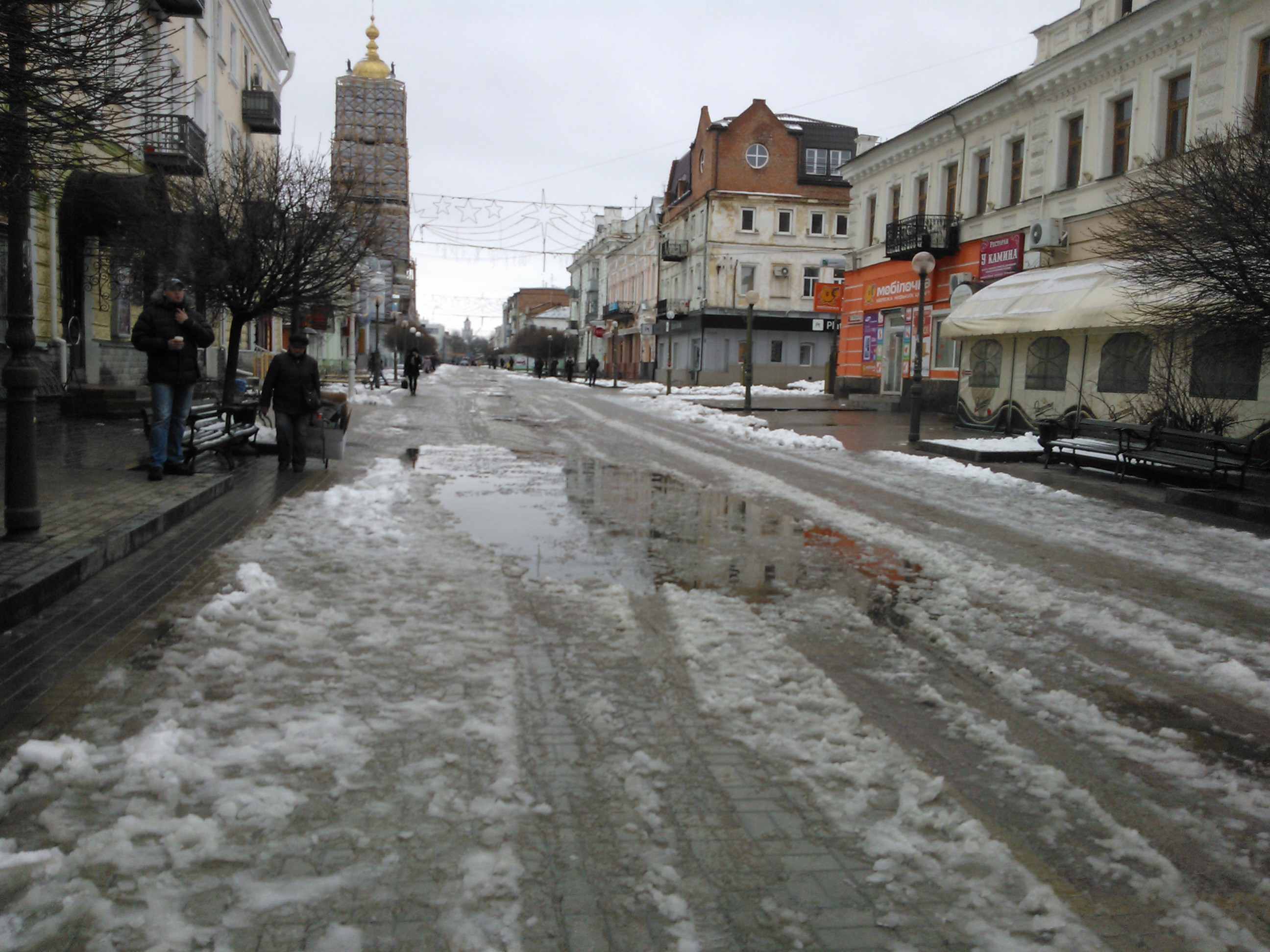 После ночного снегопада коммунальные службы нашего города еще не успели проснуться, а главная улица вместе с его жителями утонула. Невольно вспоминается песня украинского исполнителя Кузьмы Скрябина «Люди як кораблі», так и сумчане превратились в надувные лодки, дрейфующие по краям, более сухой части улицы.