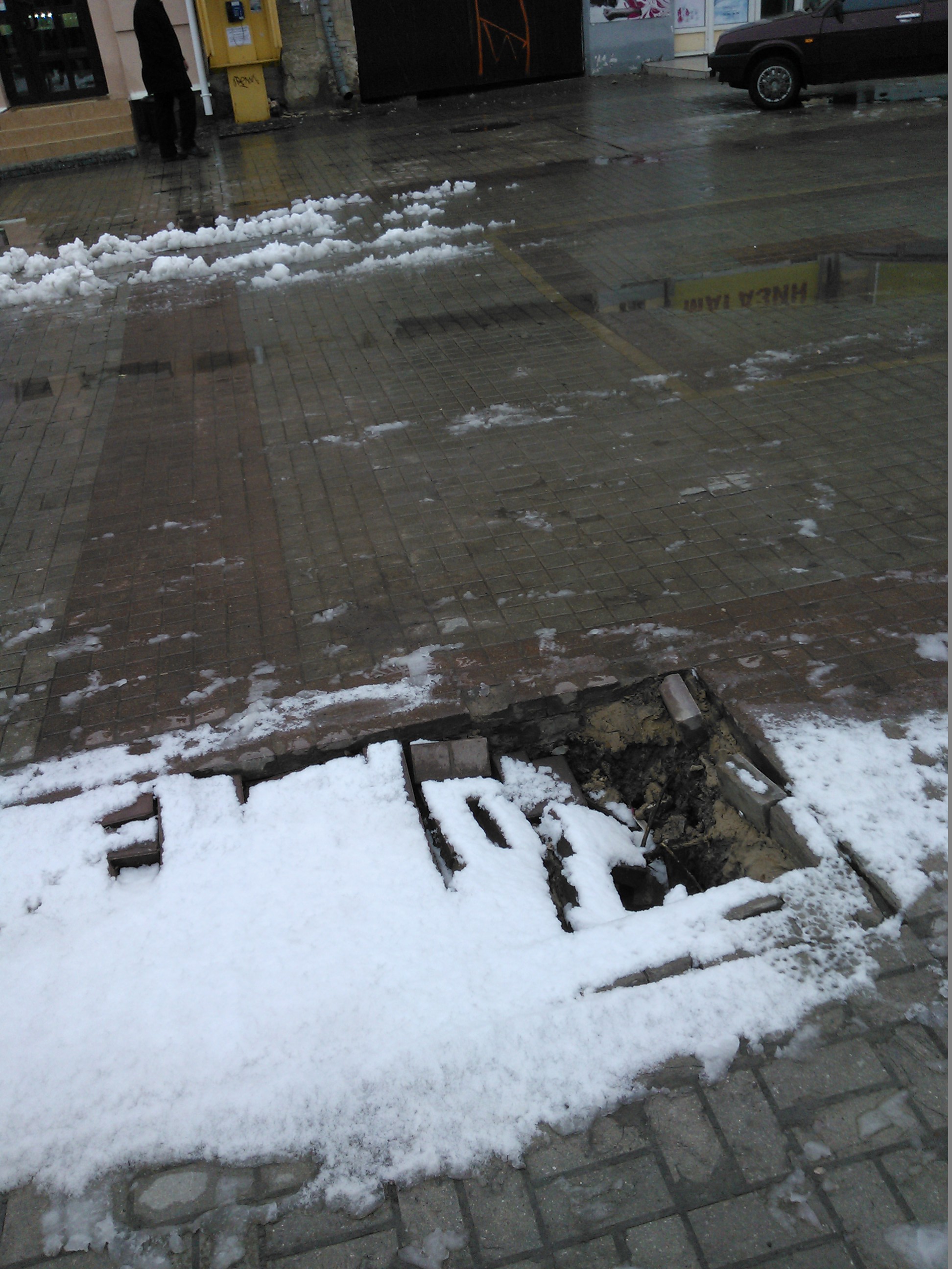 Для тех, кто сможет пройти (проплыть, проскользить) большую часть улицы невредимым, коммунальные службы приготовили еще один сюрприз - очередной провал, который не только никак не ликвидируют, но даже не оградили до сих пор.