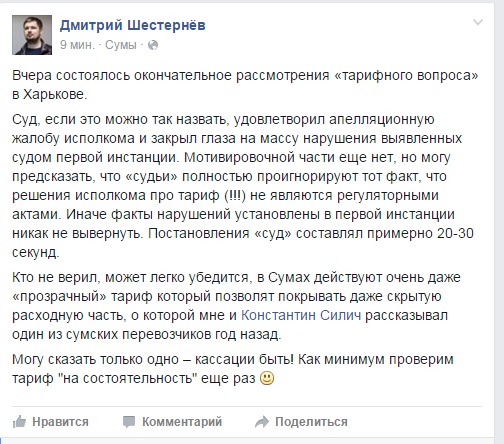 Напомним, что 18 декабря Заречный районный суд Сум удовлетворил исковые требования юриста, активиста ДемАльянса Дмитрия Шестернева, чем фактически утвердил, что с подачи городских властей перевозчики в Сумах уже почти год незаконно берут 3 грн. за проезд вместо 2 грн. На это решение была подана апелляционная жалоба.