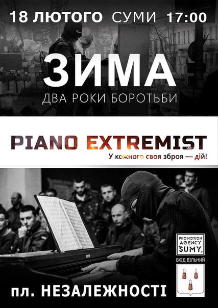 К годовщине Революции Достоинства! PIANO EXTREMIST впервые сыграет в Сумах концерт! 18 февраля в 17.00 на площади Независимости.