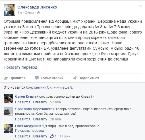 «Отримав повідомлення від Асоціації міст України. Верховна Рада України ухвалила Закон «Про внесення змін до додатків № 3 та № 7 Закону України «Про Державний бюджет України на 2016 рік» щодо фінансового забезпечення компенсації за пільговий проїзд окремих категорій громадян та інших передбачених законодавством пільг». Наше звернення до голови ВР, ухвалене депутатами Сумської міської ради 16 лютого, з вимогами прийняти цей законопроект, не було марним. Дякую керівникам інших міст, які направляли схожі звернення до столиці!» - написал градоначальник.