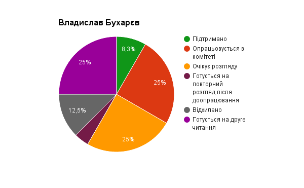 По 24 законопроекта на усмотрение парламента представили член фракции политической партии «Всеукраинское объединение «Батькивщина» Владислав Бухарев и внефракционный Андрей Деркач. Интересно, что статистика поддержанных инициатив этих депутатов также одинакова: по 2 законопроекта. У Владислава Бухарева это законопроекты «О Государственном бюро расследований» и «О внесении изменений в некоторые законы Украины относительно обеспечения гарантий социальной защиты бывших работников органов внутренних дел Украины и членов их семей», а у Андрея Деркача постановление «О праздновании 95-летия со дня рождения Ивана Никитовича Кожедуба »и проект закона« О внесении изменений в некоторые законы Украины относительно обеспечения расчетов в топливно-энергетическом комплексе относительно государственного предприятия «Национальная атомная энергогенерирующая компания« Энергоатом».