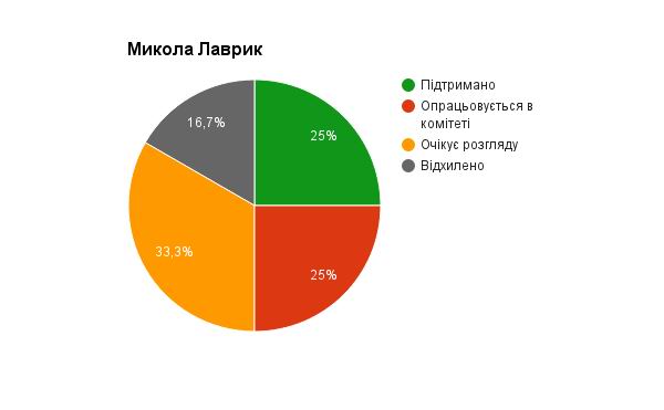 Реже среди мажоритарщиков Сумщины с законотворческой инициативой выступал Николай Лаврик, представляющий депутатскую фракцию партии «БЛОК ПЕТРА ПОРОШЕНКО». Он является соавтором 12 законопроектов, из которых три поддержано: постановления "О проведении парламентских слушаний на тему: "Семейная политика Украины - цели и задачи" и "О праздновании 175-летия со дня рождения Михаила Драгоманова (в 2016 году)", а также проект закона "О внесении изменений в приложения № 3 и № 7 Закона Украины" О Государственном бюджете Украины на 2016 год "относительно финансового обеспечения компенсации за льготный проезд отдельных категорий граждан и других предусмотренных законодательством льгот".