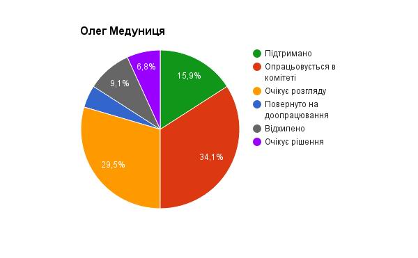 В частности, в первый день работы Верховной Рады на второе чтение поступил проект закона «Об открытости использования публичных средств», одним из авторов которого является Олег Медуница. Этот Закон был принят 11 февраля 2015 года.