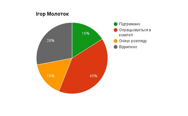 Среди поддержанных два постановления: «О праздновании 95-летия со дня рождения Ивана Никитовича Кожедуба» и «О мерах по подготовке и празднованию 80-летия Института истории Украины Национальной академии наук Украины», и два проекта законов: «О внесении изменений в Бюджетный кодекс Украина по целевому направления экологического налога» и «О внесении изменений в Бюджетный кодекс Украины относительно реализации рекомендации, предоставленной в рамках выполнения Плана действий по либерализации ЕС визового режима для Украины, по обеспечению функционирования Национального агентства Украины по вопросам выявления, розыска и управления активами, полученными от коррупционных и других преступлений». При этом статистика отклоненных инициатив депутата достаточно высокой: 7 из 25 законопроектов.