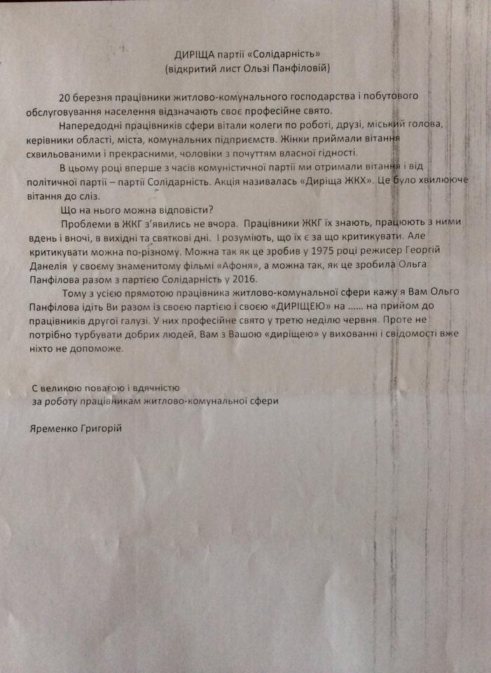 Сегодня на аппаратном совещании директор департамента инфраструктуры Григорий Яременко прочитал открытое письмо, в котором «поблагодарил» организаторов акции за подарок и посоветовал им сходить на… прием к врачам.