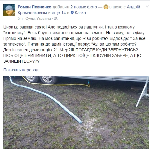 В частности, речь идет о сотрудниках цирка, которые позволяют себе сливать грязь со своих вагончиков прямо на землю. Об этом написал на своей странице в фейсбук горожанин Роман Левченко и поделился фото.