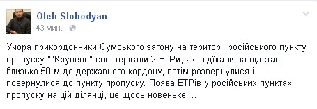 Сотрудники Государственной пограничной службы в Сумской области вчера, 24 марта, зафиксировали 2 БТРа на территории российского пункта пропуска "Крупец". Об этом в на своей странице в Facebook сообщил помощник главы ведомства Олег Слободян.