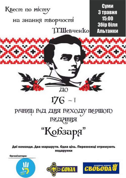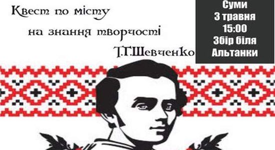 3 мая 2016 года в Сумах по случаю 176 годовщине со дня публикации первого издания "Кобзаря", у вас есть возможность продемонстрировать свои знания о жизни и творчестве Тараса Шевченко, ловкость и логическое мышление, принимая участие в интеллектуальном квесте!