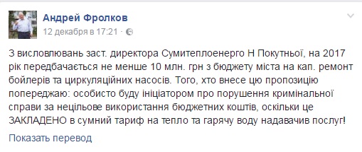 Такие планы властей и «Сумытеплоэнерго» общественность оценила по-своему. В частности, член общественной экспертной комиссии по вопросам социально-экономического развития и бюджета Андрей Фролков на своей странице в фейсбук написал: