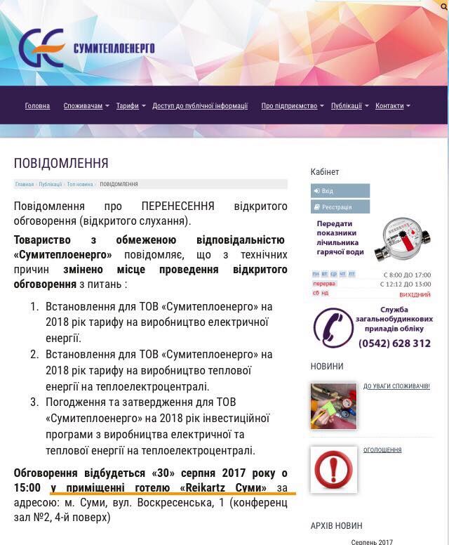 На официальном портале ООО «Сумытеплоэнерго» появилась информация о смене места проведения открытых слушаний относительно повышения тарифов на тепло и горячую воду, которые должны состояться уже завтра, 30 августа.