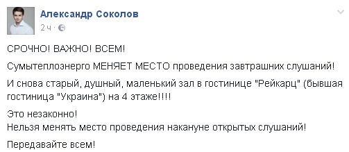 На официальном портале ООО «Су- мытеплоэнерго» появилась информация о смене места проведения открытых слушаний относительно повышения тарифов на тепло и горячую воду, которые должны состояться уже завтра, 30 августа.