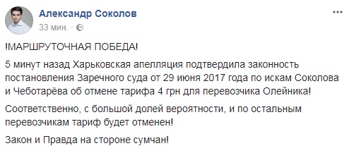 Сегодня, 18 октября, решением Харьковского апелляционного суда была поддержана отмена Заречным судом майского решения горисполкома о 4 грн для перевозчика ФЛП Олейник.