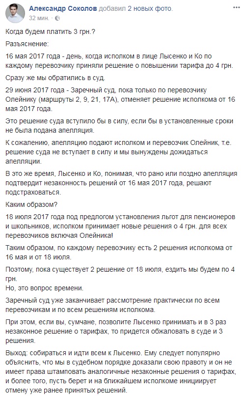 Главное, что отмечают истцы, такое решение фемиды дает надежду на то, что и все аналогичные решения горисполкома по 4 грн для перевозчиков будут также оспорены.