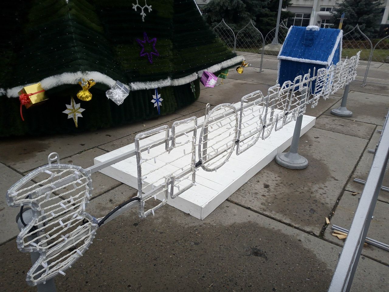 На новогодней красавице за 1,5 млн грн появились новые игрушки. Между сказочными домиками появилась обещанная надпись «С Новым годом!». Выполнена она не на плакате, как ранее, а светодиодная.