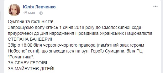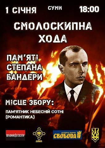 Вечером 1 января состоится уже традиционное для Сум факельное шествие памяти Степана Бандеры. Место сбора: памятник Героям Небесной Сотни (МЦ «Роментика»).