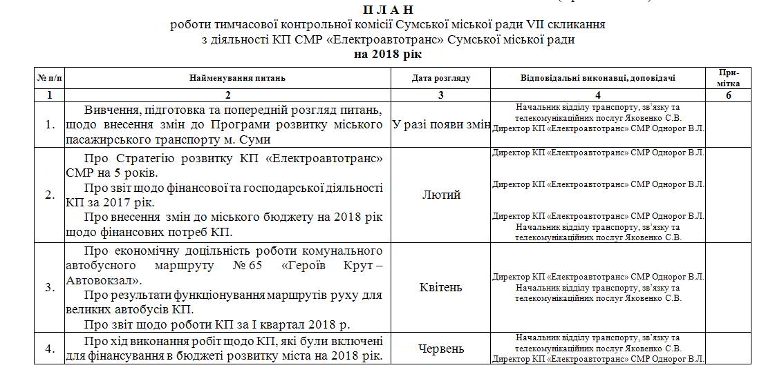 Голова тимчасової контрольної комісії Сумської міськради з діяльності КП «Електроавтот- ранс» Олексій Рябенков оприлюднив проект плану роботи комісії протягом 2018-го року.