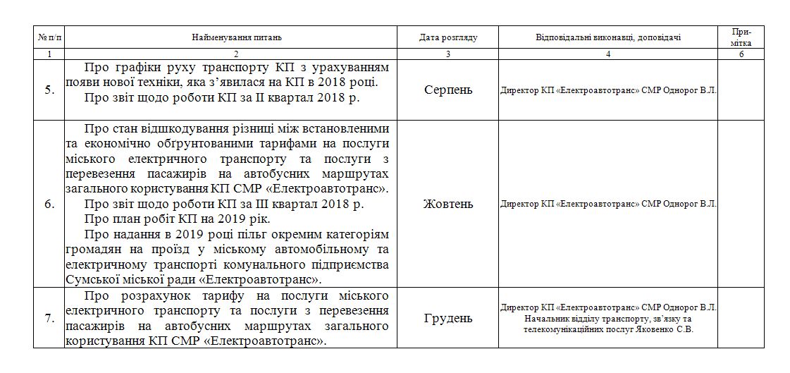 Так, у лютому передбачається заслухати стратегію розвитку КП «Електроавтотранс» на 5-ть років, фінансовий звіт за попередній рік та визначитися зі змінами до міського бюджету на 2018 рік щодо потреб підприємства. У квітні планують розглянути питання економічної доцільністі роботи комунального автобусного маршруту № 65 «Героїв Крут – Автовокзал», виходячи з результатів його діяльності та звіт щодо роботи КП за І квартал 2018 року. У червні має бути розглянутий хід виконання робіт щодо «Електроавтотрансу», які були включені для фінансування в бюджеті розвитку міста на 2018 рік. У серпні розглядатимуть питання щодо графіків руху транспорту з урахуванням появи нової техніки, яка має з’явитися на КП в 2018 році та звіт щодо роботи підприємства за ІІ квартал 2018 р. У жовтні вивчатимуть стан відшкодування різниці між установленими та економічно обґрунтованими тарифами на послуги міського електричного транспорту та послуги з перевезення пасажирів на автобусних маршрутах «Електроавтотрансу». Заслухають звіт щодо роботи КП за ІІІ квартал 2018 року та план робіт на 2019 рік, а також розглянуть питання про надання в 2019 році пільг на проїзд у комунальному транспорті. У грудні 2018 року заслухають розрахунок тарифу на послуги комунального підприємства. Також, протягом усього часу роботи комісії, будуть розглядатися питання, щодо внесення змін до програми розвитку міського пасажирського транспорту у разі появи таких змін.