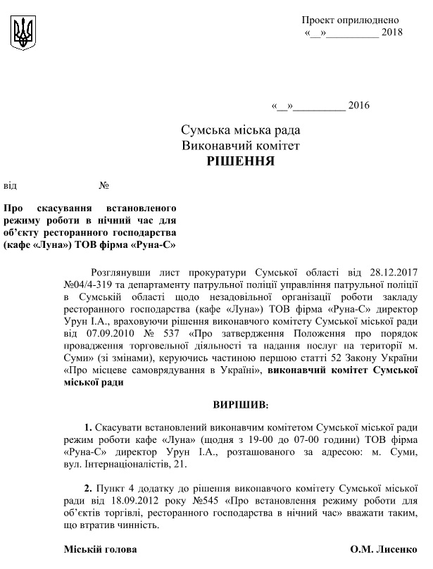 Варто зазначити, що рішенням виконкому від вересня 2010 року для нічного клубу погоджено режим роботи з 19:00 до 7:00.