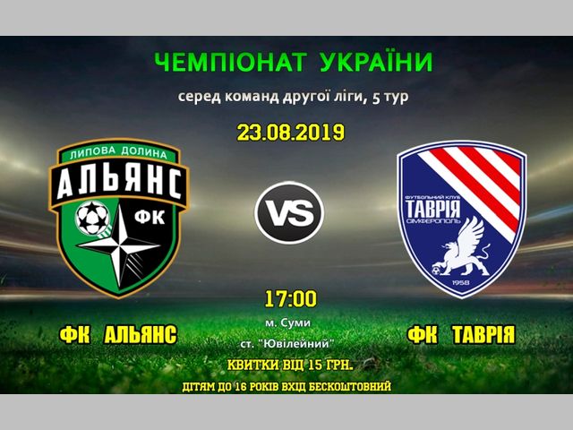 У п'ятницю, 23 серпня, в Сумах пройде матч 5-го туру чемпіонату України з футболу у другій лізі. Липоводолинський «Альянс» на стадіоні «Ювілейний» прийматиме «Таврію Сімферополь»