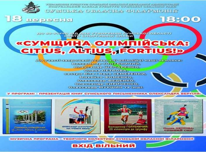 Від січня 2019 року на Сумщині проходять заходи до 80-річчя від дня утворення Сумської області. Сьогодні в обласній філармонії відбудеться свято «Сумщина олімпійська: «CITIUS, ALTIUS FORTIUS» Від січня 2019 року на Сумщині проходять заходи