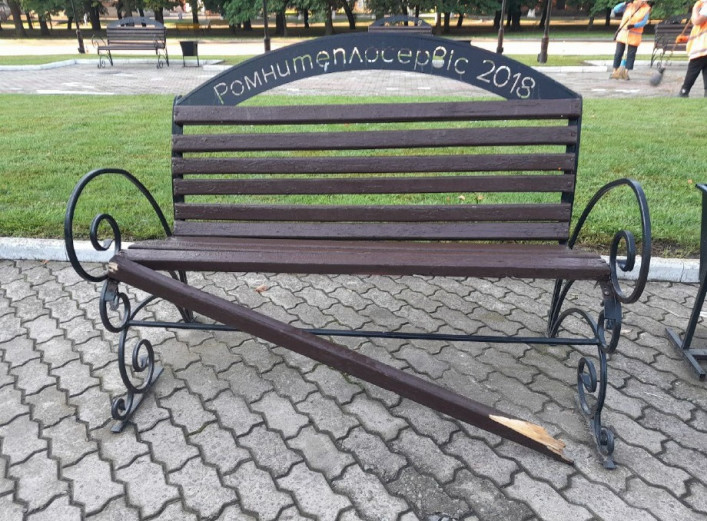 На Алеї Слави в Ромнах, де вшановують пам'ять загиблих військових, невідомі пошкодили лавки. Про це повідомив мер Ромен Олег Стогній. За його словами, він побачив зламані лавки під час огляду території. Міський голова висловив нерозуміння щодо