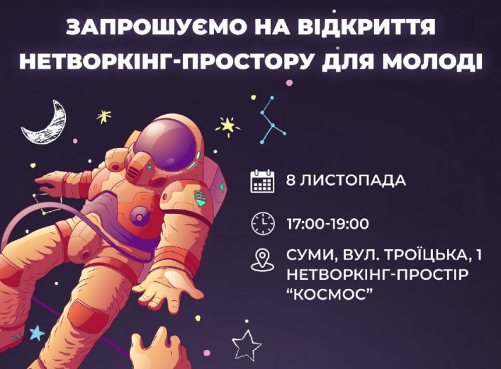 У п'ятницю, 8 листопада, о 17:00 у Сумах за адресою вул. Троїцька, 1 відкривається новий молодіжний простір "Космос". Ініціатором створення простору є ГО "Ліга сучасних жінок" за підтримки міжнародної гуманітарної організації Людина у скруті