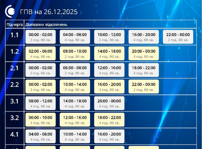 У п'ятницю, 26 грудня, на території Сумської області продовжуватимуть діяти графіки погодинних відключень. Обмеження електропостачання впроваджуються відповідно до розпоряджень НЕК «Укренерго». Енергетики нагадують, що єдиною
