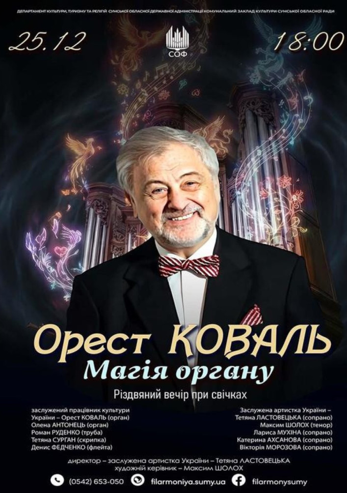 Різдвяний концерт «Магія органу» відбудеться у форматі камерного вечора при свічках. Органне звучання наповнить залу світлом, гармонією та різдвяною тишею, створюючи атмосферу миру, спокою й духовного піднесення. Мелодії, що народжуються