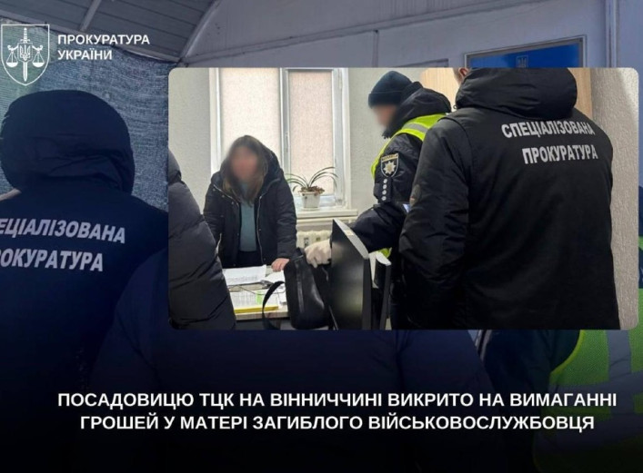 Посадовицю територіального центру комплектування та соціальної підтримки на Вінниччині викрито на вимаганні грошей у матері загиблого військовослужбовця. Про це повідомляють правоохоронні органи. За даними слідства, у квітні 2023 року посадовиця
