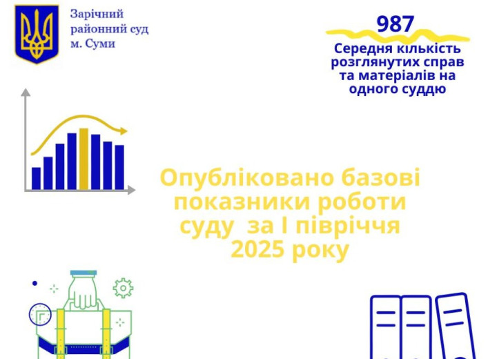 Зарічний районний суд Сум оприлюднив підсумки роботи за перше півріччя 2025 року, демонструючи значне навантаження на суддів. При фактичній кількості 9 суддів, кожен з них в середньому розглянув майже тисячу справ. Ключові показники роботи