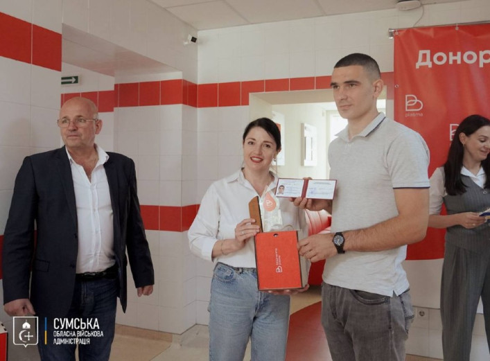 Заступниця начальника Сумської обласної військової адміністрації Олена Кірєєва вручила посвідчення донорам, які досягли нормативу з безоплатної здачі крові. Почесними донорами стали Вадим Аполонов, Валерій Дегтярьов, Ольга Кудояр, Віталій Проценко,