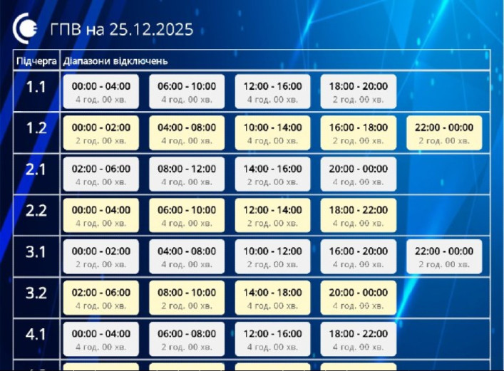 Завтра, 25 грудня, на території Сумської області застосовуватимуться графіки погодинних відключень. Відповідне розпорядження надійшло від НЕК «Укренерго» для стабілізації енергосистеми. Як повідомили в АТ «Сумиобленерго»,