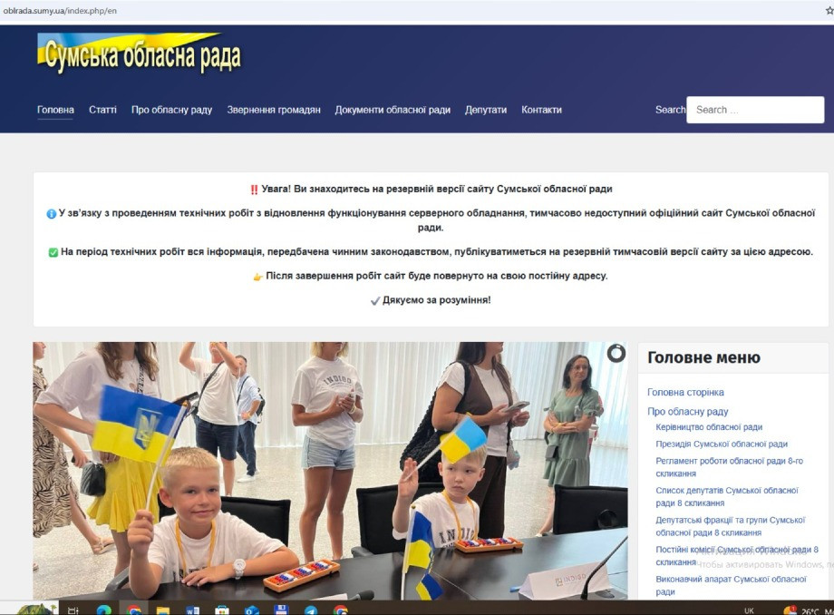 Сумська обласна рада повідомила про тимчасову недоступність свого офіційного сайту. Це пов'язано з технічними роботами, спрямованими на відновлення роботи серверного обладнання. На час проведення робіт уся важлива інформація публікуватиметься