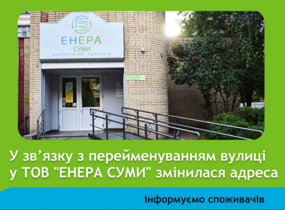 У ТОВ "ЕНЕРА СУМИ" нова адреса: 40004, Сумська область, м. Суми, вул. Терещенка Віталія, буд. 35. Зміни пов’язані з перейменуванням вулиці Ремісничої. Відтак оновлено договір про постачання електричної енергію постачальником універсальних