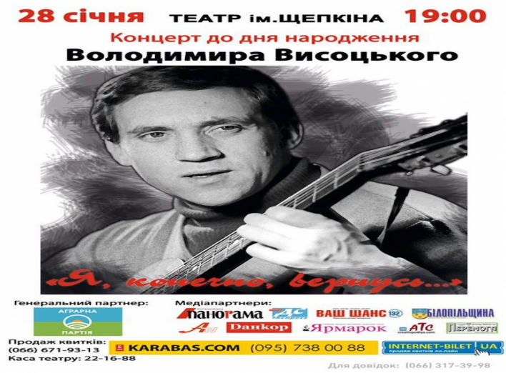 Культурною подією січня-2019 у Сумах очікувано має стати Концерт до дня народження знаного барда Володимира Висоцького - "Я, конечно, вернусь...". Культурною подією січня-2019 у Сумах очікувано має стати Концерт до дня народження знаного барда