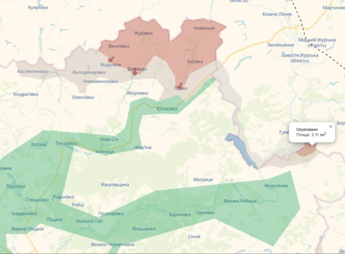 Згідно з картою аналітичного проєкту DeepState, площа окупованої росією території на Сумщині зросла. У районі Хотінської та Юнаківської громад ситуація залишається без змін – там під контролем противника 93 кв. км. Проте в Миропільській