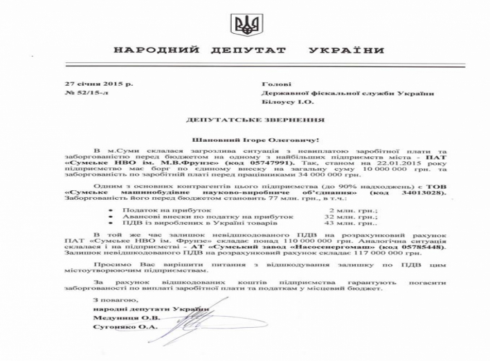Народные депутаты Александр Сугоняко и Олег Медуница обратились к Главе Государственной фискальной службы Украины относительно возмещения остатка по НДС на счет завода им. Фрунзе в сумме 110 млн.грн. Об этом сообщил Александр Сугоняко у себя