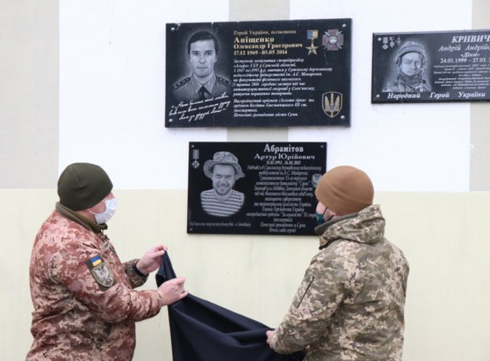 У Сумах відбулось відкриття пам’ятної дошки загиблому на сході України воїна АТО, Почесного громадянина Сум Артура Абрамітова, який загинув 26 лютого 2017 року У Сумах відбулось відкриття пам’ятної дошки загиблому на сході України