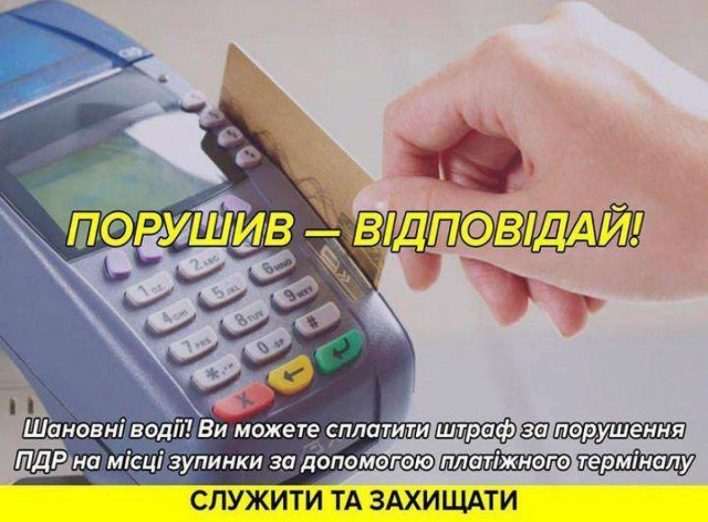 скористатись для оплати штрафу за порушення ПДР на місці зупинки. Водії та пішоходи можуть сплатити штраф на місці скоєння правопорушення за допомогою платіжної картки. Якщо Ви не маєте при собі платіжної картки, штраф можна