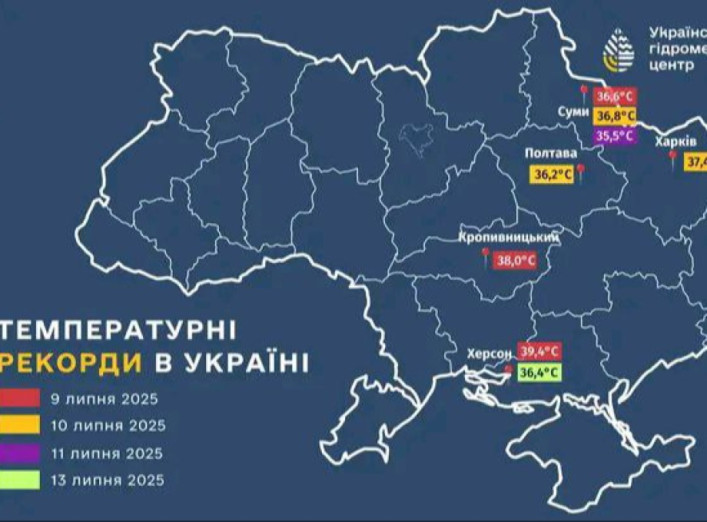 Минулого тижня на Сумщині тричі фіксували температурні рекорди. Загалом, по Україні нові температурні максимуми встановлювалися 9, 10, 11 та 13 липня 2025 року. На Сумщині стовпчики термометрів показали: 9 липня – 36,6°C 10