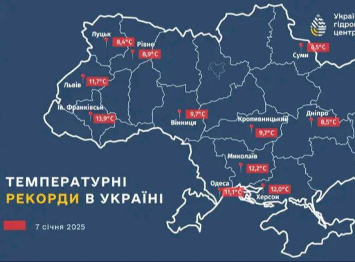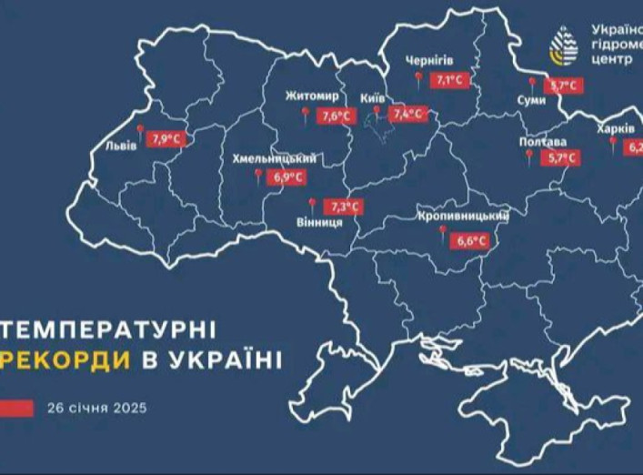 26 січня в Україні було зафіксовано кілька температурних рекордів. Згідно з даними Укргідрометцентру, денні температури в деяких областях значно перевищили середні показники для цього періоду. Найвищий температурний рекорд цього дня був зафіксований