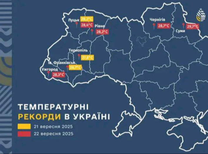 22 вересня на Сумщині було встановлено новий температурний рекорд. Повітря прогрілося до +29,7°С, що стало найвищим показником серед областей-рекордсменів України. Цього дня низка українських областей побила попередні історичні максимуми. Нагадаємо,