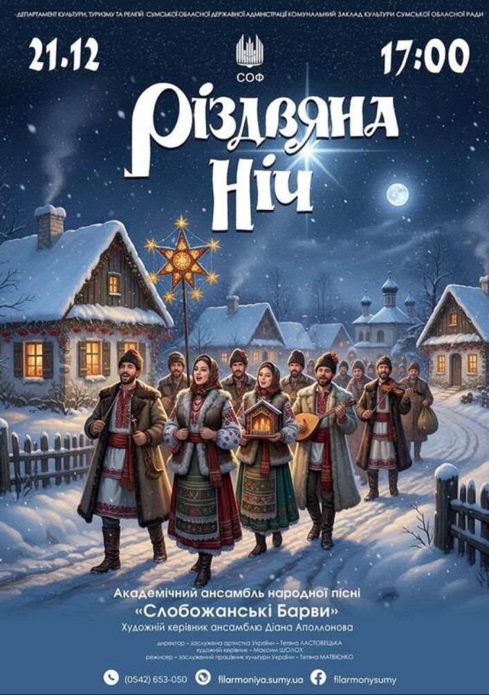 У Сумській обласній філармонії відбудеться сольний концерт Академічного ансамблю народної пісні «Слобожанські барви» під назвою «Різдвяна ніч». Це музичний вечір, сповнений духу Різдва, українських традицій та щирої пісенної