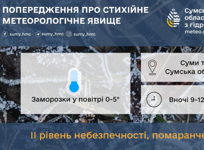 ускладнення погодних умов на Сумщині. За даними обласного гідрометцентру, з 14 по 16 листопада очікується хмарна погода зі снігом, дощем та ожеледицею на дорогах. 14 листопада: Хмарно, вночі невеликий мокрий сніг, місцями