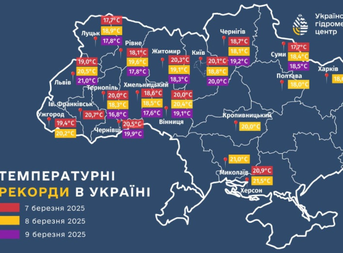 березня +18,5°C Загалом, в Україні протягом цих днів також спостерігалися температурні рекорди, зокрема, найвища температура була зафіксована у Херсоні – +21,5°C. Метеорологи попереджають, що високі температури