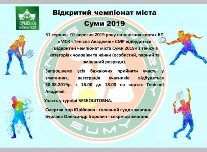 31 серпня - 1 вересня на кортах «Тенісної академії» пройде відкритий чемпіонат Сум з тенісу. До участі запрошуються всі бажаючі. Участь безкоштовна. 31 серпня - 1 вересня на кортах «Тенісної академії» пройде відкритий чемпіонат