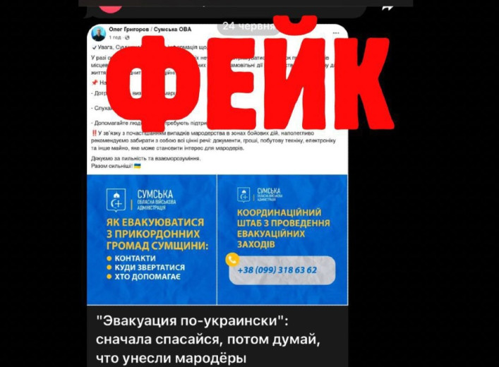 У проросійських Telegram-каналах поширили неправдивий скріншот, який нібито є дописом з офіційної сторінки начальника Сумської ОВА Олега Григорова. У цьому фейковому повідомленні міститься «рекомендація» забирати з собою гроші, побутову