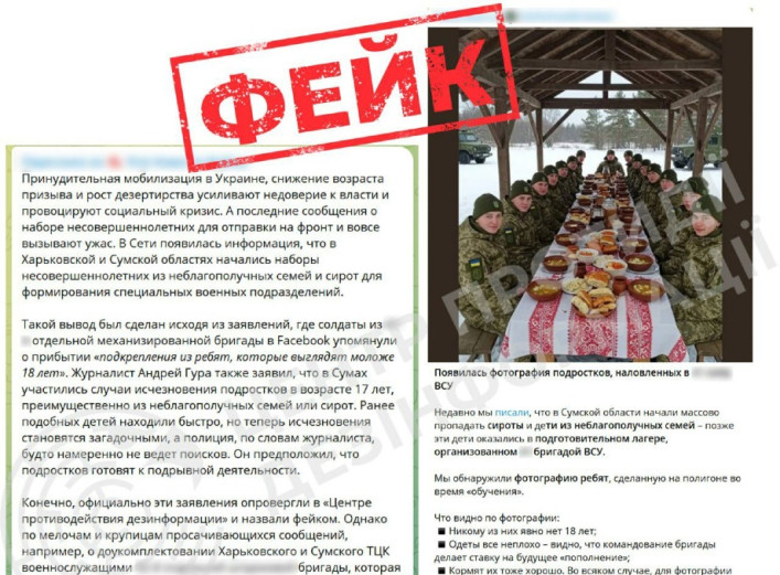 неправдива інформація про нібито "таємну мобілізацію" 17-річних підлітків-сиріт з дитячих будинків на Сумщині. Ці фейки стверджують, що підлітків примусово звозять до тренувальних таборів, щоб після досягнення ними