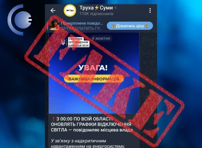 У мережі знову поширюється неправдива інформація про нібито запровадження в Сумській області графіків відключення електроенергії. Мета таких фейків — викликати негативні настрої серед мешканців, що «грає на руку лише ворогу». Як